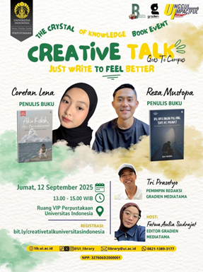 Perpustakaan Universitas Indonesia (UI) sukses menyelenggarakan Creative Talk atau diskusi buku bertema “Just Write to Feel Better” di Lobi Perpustakaan UI, Depok, Jumat (12/09/2025). Acara ini menjadi bagian dari rangkaian The Crystal of Knowledge Book Event 2025 yang digelar sepanjang 1–30 September 2025.
