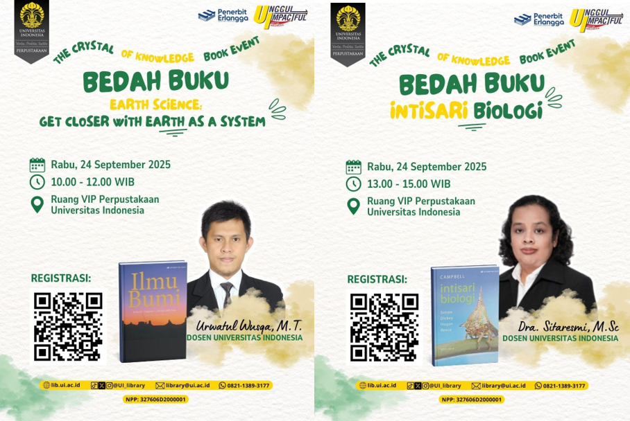 Dalam rangkaian acara The Crystal of Knowledge Book Event 2025, Perpustakaan Universitas Indonesia bekerja sama dengan Penerbit Erlangga menghadirkan sesi Bedah Buku Ilmu Bumi dan Intisari Biologi yang berlangsung meriah di Ruang VIP, Perpustakaan UI, Depok pada Rabu (24/09/2025). Acara ini mengupas buku-buku ilmiah terjemahan yang kini tersedia dalam bahasa Indonesia dengan menghadirkan narasumber dosen dari Universitas Indonesia. Kepala Perpustakaan UI, Luluk Tri Wulandari, M.Hum, secara resmi membuka acara ini beserta Koordinator Manajemen Pengetahuan, Lusiana Monohevita, M.Hum.